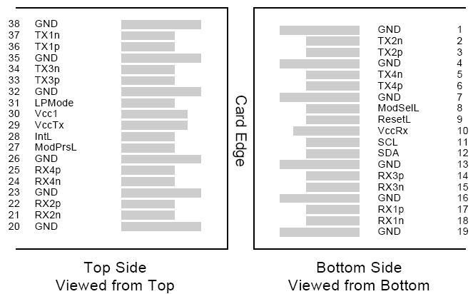 El puerto de interfaz óptica es un conector MPO macho. Las cuatro posiciones de fibra de la izquierda, como se muestra en la Figura 2 (con la llave hacia arriba), se utilizan para las señales de transmisión óptica (canales 1 a 4). Las posiciones de fibra de la derecha se utilizan para las señales de recepción óptica (canales 4 a 1). Las cuatro fibras centrales están físicamente presentes.
